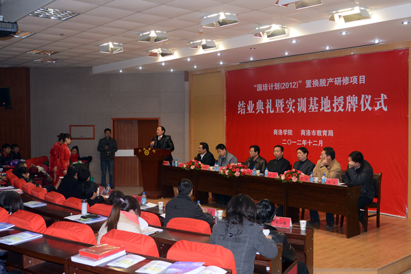 12月12日上午,我院舉行“國培計(jì)劃(2012)”置換脫產(chǎn)研修項(xiàng)目結(jié)業(yè)典禮暨實(shí)訓(xùn)基地授牌儀式。院紀(jì)委書記、學(xué)院“國培計(jì)劃”和省級(jí)培訓(xùn)項(xiàng)目領(lǐng)導(dǎo)小組副組長王思懷,商洛市教育局副局長白發(fā)善,陜西省“國培計(jì)劃”項(xiàng)目執(zhí)行辦公室項(xiàng)目部主任蘇理、副主任羅昆山,我院中文系主任、學(xué)院“國培計(jì)劃”和省級(jí)培訓(xùn)項(xiàng)目領(lǐng)導(dǎo)小組成員黃元英,數(shù)學(xué)與計(jì)算科學(xué)系主任、學(xué)院“國培計(jì)劃”和省級(jí)培訓(xùn)項(xiàng)目領(lǐng)導(dǎo)小組成員李超,商洛市教育局基礎(chǔ)科科長張斌出席了儀式。儀式由我院成人教育學(xué)院院長任少儉主持。
