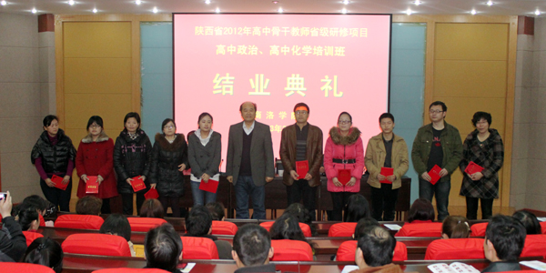 3月12日上午,我院承辦的陜西省2012年高中骨干教師省級(jí)研修項(xiàng)目高中政治、高中化學(xué)培訓(xùn)班舉辦了結(jié)業(yè)典禮。院長、學(xué)院“國培計(jì)劃”和省級(jí)培訓(xùn)項(xiàng)目領(lǐng)導(dǎo)小組組長張景書,副院長、學(xué)院“國培計(jì)劃”和省級(jí)培訓(xùn)項(xiàng)目領(lǐng)導(dǎo)小組副組長劉建林親臨結(jié)業(yè)典禮現(xiàn)場(chǎng),與學(xué)員們合影留念,并為學(xué)員們頒發(fā)證書。