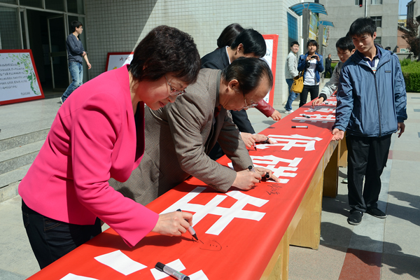 曾佳偉代表全校學生做了表態(tài)發(fā)言。出席儀式的領導和學生代表們在“節(jié)能減排,低碳生活”宣傳橫幅上簽名。