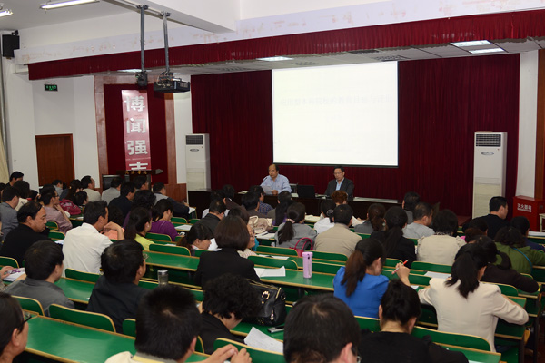 為了推動我?!霸鯓咏ㄔO(shè)好應(yīng)用型本科院?!贝笥懻撋钊腴_展,促進(jìn)師生了解應(yīng)用型本科院校的本質(zhì)特點(diǎn)、發(fā)展戰(zhàn)略與教育目標(biāo),5月10日,宣傳部、教務(wù)處和人文社會科學(xué)系特邀廈門大學(xué)博士生導(dǎo)師、教育部普通高等學(xué)校教學(xué)工作水平評估專家組成員史秋衡教授,為我校黨委中心學(xué)習(xí)組成員,各系部、各部門黨政負(fù)責(zé)人作了題為《地方本科院校中長期發(fā)展戰(zhàn)略若干思考》的主題報(bào)告,為中級職稱以上教師和部分學(xué)生作了題為《應(yīng)用型本科院校教育目標(biāo)與評價(jià)》的專題報(bào)告。校黨委書記張繼良、副院長劉建林分別主持了兩場報(bào)告會。