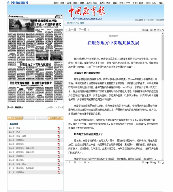 近年來,在全校師生員工的共同努力下,我校教學(xué)科研工作取得了長足的發(fā)展,教育教學(xué)成果豐碩、成就顯著,引起了社會(huì)各界的高度關(guān)注。6月17日,《中國教育報(bào)》刊登院長張景書署名文章《商洛學(xué)院:在服務(wù)地方中實(shí)現(xiàn)共贏發(fā)展》,全面介紹了我校立足地方、服務(wù)地方,在建設(shè)特色鮮明、多學(xué)科協(xié)調(diào)發(fā)展的應(yīng)用型普通本科院校歷程中所做的工作和取得的成績。