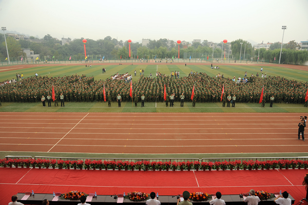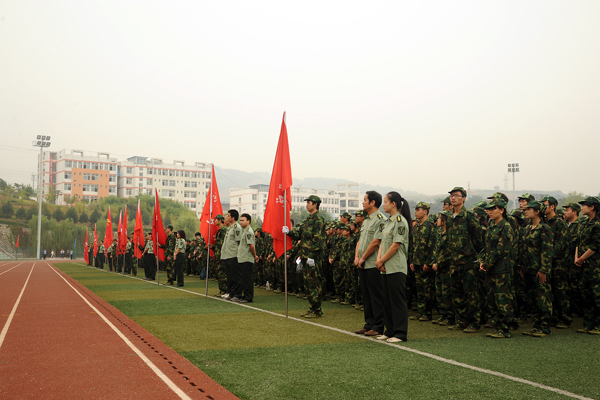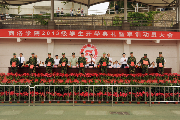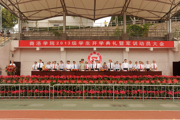 秋高氣爽、丹桂飄香,9月7日上午,我校隆重舉行2013級新生開學(xué)典禮暨軍訓(xùn)動員大會。校領(lǐng)導(dǎo)張景書、劉建林、左曉民、王思懷、陳永莊、魏書堂.武警商洛支隊參謀長向軍,商洛供電局副局長趙紅強,商洛聯(lián)通副總經(jīng)理陳安民出席了大會。校黨委書記張景書向承訓(xùn)教官授2013級學(xué)生軍訓(xùn)團團旗,黨委副書記、校長劉建林做了重要講話。大會由黨委副書記左曉民主持。各系部黨政負責(zé)人、各職能部門負責(zé)人與來自全國27個?。ㄊ?、自治區(qū))的3000余名2013級新生參加了大會。