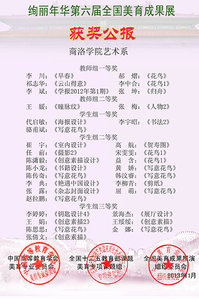 其中,藝術(shù)系被評(píng)為“全國(guó)藝術(shù)美育先進(jìn)單位”、“藝術(shù)美育教學(xué)成果二等獎(jiǎng)”、“藝術(shù)美育教學(xué)模范系”。藝術(shù)系3名教師獲得藝術(shù)美育個(gè)人教學(xué)成果一等獎(jiǎng)。藝術(shù)系李中合教授等的作品獲得特等獎(jiǎng)2項(xiàng)、一等獎(jiǎng)9項(xiàng)、二等獎(jiǎng)2項(xiàng);學(xué)生代啟敏等的作品獲得一等獎(jiǎng)3項(xiàng)、二等獎(jiǎng)15項(xiàng)、三等獎(jiǎng)7項(xiàng)。同時(shí),12名師生的作品入選2014故宮太廟全國(guó)高校教師(大學(xué)生)優(yōu)秀藝術(shù)作品展。