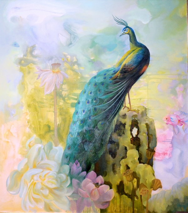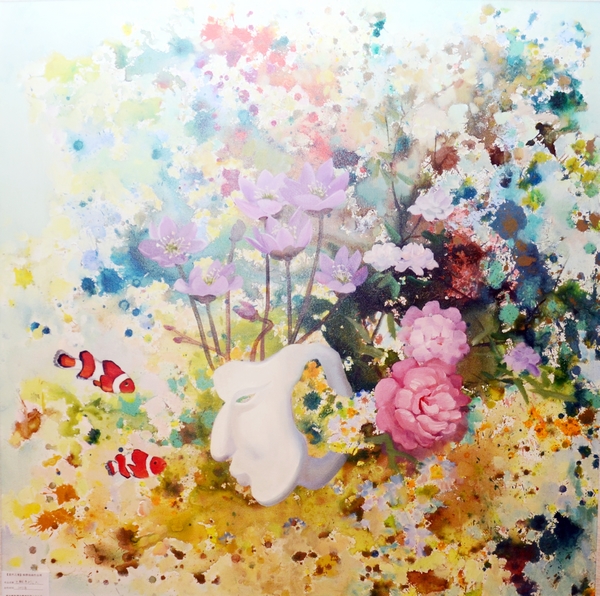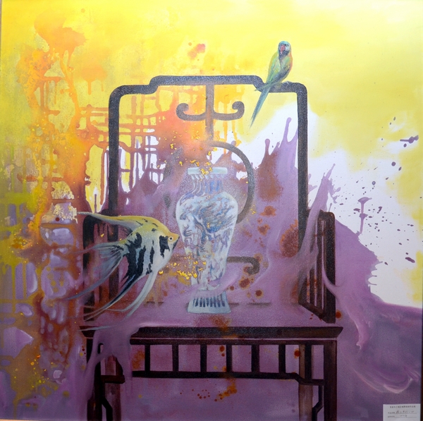 楊靜的作品多以意象風(fēng)景為主,魚、飛鳥、椅子、面具、鮮花常常成為畫面中的主要視覺符號(hào),意象化的表述方式是其繪畫語(yǔ)言特點(diǎn),獨(dú)具視覺張力的畫面背后蘊(yùn)藏著或浪漫或神秘或抒情的藝術(shù)獨(dú)白。她的作品,一切似乎都是從畫布的縫隙間不經(jīng)意地流淌、蔓延而出,生發(fā)、幻化出諸多“意外之境”,堅(jiān)實(shí)的文化底蘊(yùn)與繪畫技能,獨(dú)到的藝術(shù)眼界和隨機(jī)靈動(dòng)的“深思妙悟”,賦予畫面中各種意象生命,讓畫內(nèi)的意象引領(lǐng)聯(lián)想畫外意象,達(dá)成“象外之象,景外之景”的效果,結(jié)合自己的生命體驗(yàn)詮釋對(duì)當(dāng)代人及其生存環(huán)境的思索與追問,在虛實(shí)相生之間營(yíng)造一個(gè)全新的美好境界。本次畫展共展出作品50多件,且全部被3家藝術(shù)投資機(jī)構(gòu)收藏。