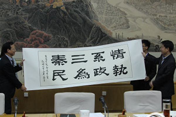 為了表示對省政府的謝意,我校學(xué)生特意創(chuàng)作了一幅“情系三秦,執(zhí)政為民”的書法作品,贈送給孟軍。