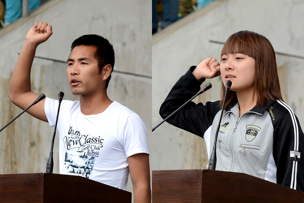 運(yùn)動(dòng)員代表劉曉瑩、裁判員代表洪福祥,分別代表全體運(yùn)動(dòng)員、裁判員宣誓。