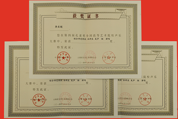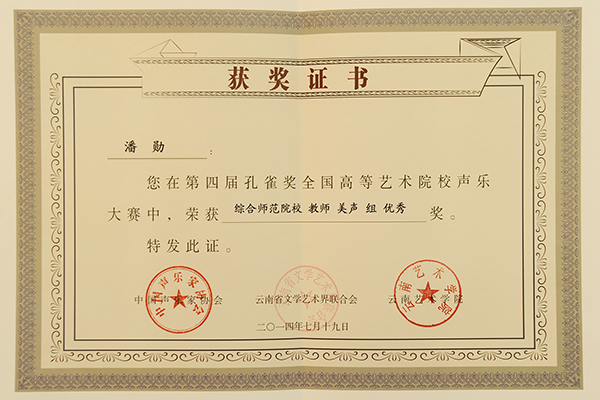 暑假期間,由中國(guó)聲樂(lè)家協(xié)會(huì)、云南省文學(xué)藝術(shù)界聯(lián)合會(huì)、云南藝術(shù)學(xué)院主辦的第四屆孔雀獎(jiǎng)全國(guó)高等藝術(shù)學(xué)校聲樂(lè)大賽在云南藝術(shù)學(xué)院音樂(lè)學(xué)院舉辦。我校藝術(shù)學(xué)院潘勛等5名師生參加比賽并獲得四項(xiàng)獎(jiǎng)勵(lì)。
