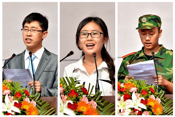 城鄉(xiāng)規(guī)劃與建筑工程學院教師趙培博士,2012級電子信息與電氣工程學院宋丹,2014級語言文化傳播學院學生鄢守航分別代表學校教師、在校生和新生作了發(fā)言。