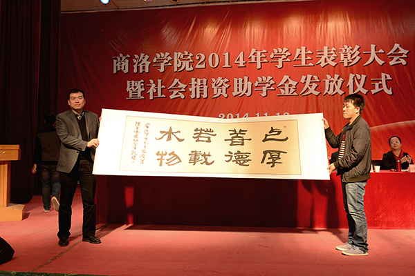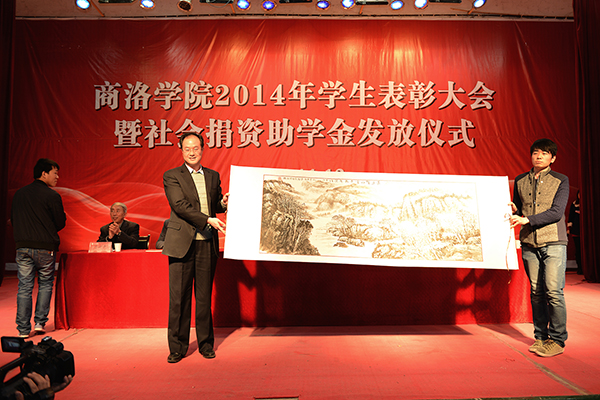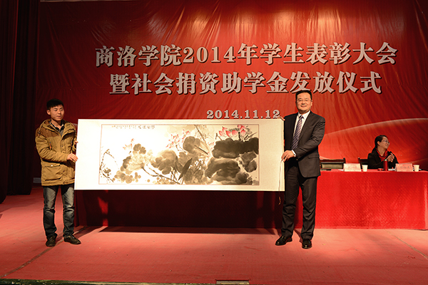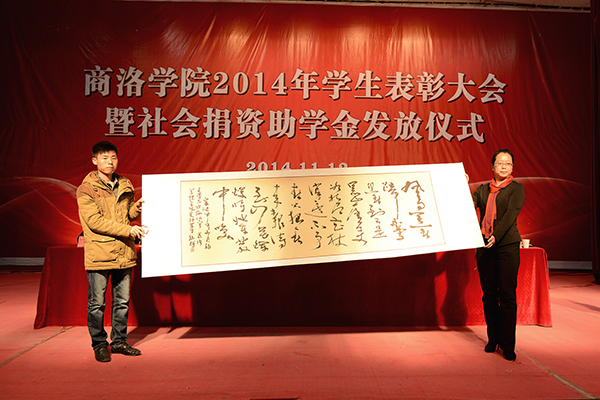 為了答謝4家企業(yè)對我校學(xué)生的無私資助,受助學(xué)生代表現(xiàn)場向商洛供電局、中國郵政商洛分公司、中國聯(lián)通商洛分公司和中國電信商洛分公司敬贈了4幅自己創(chuàng)作的書畫作品。學(xué)生王聰、張思思分別代表受表彰的先進個人和受資助學(xué)生作了大會發(fā)言。