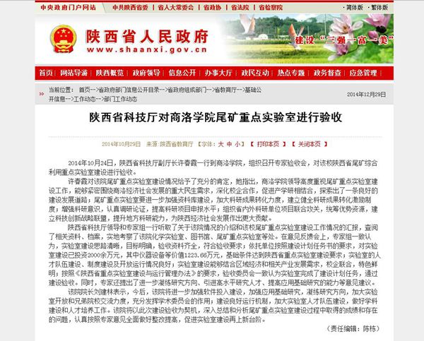 陜西省人民政府網(wǎng)站10月29日以《陜西省科技廳對(duì)商洛學(xué)院尾礦重點(diǎn)實(shí)驗(yàn)室進(jìn)行驗(yàn)收》進(jìn)行報(bào)道。(http://www.shaanxi.gov.cn/0/xxgk/1/2/4/22/35/39/124/42455.htm)