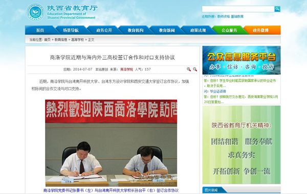 陜西省教育廳7月7日,以《商洛學(xué)院近期與海內(nèi)外三高校簽訂合作和對(duì)口支持協(xié)議》為題進(jìn)行報(bào)道。(http://www.snedu.gov.cn/jynews/gdxx/201407/07/42650.html)