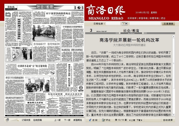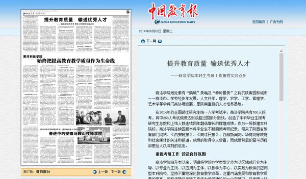 《中國(guó)教育報(bào)》5月20日以《提升教育質(zhì)量 輸送優(yōu)秀人才——商洛學(xué)院本科生考研工作抓得實(shí)亮點(diǎn)多》為題,(http://paper.jyb.cn/zgjyb/html/2014-05/20/content_417396.htm?div=-1)對(duì)我校本科生考研及學(xué)風(fēng)建設(shè)工作成就做了專題報(bào)道, 12月10日以《搭建資助平臺(tái) 傳遞愛(ài)心力量——商洛學(xué)院校企合作愛(ài)心助學(xué)側(cè)記》為題,對(duì)我校校企合作、捐資助學(xué)工作進(jìn)行了專題報(bào)道。(http://paper.jyb.cn/zgjyb/images/2014-12/10/12/L10.pdf )