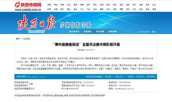 《陜西日?qǐng)?bào)》9月18日,以《“秦嶺最美是商洛”全國(guó)書法美術(shù)攝影展開(kāi)幕 》為題進(jìn)行報(bào)道。(http://esb.sxdaily.com.cn/tbarticle.do?epaper=viewarticle&AutoID=107438)