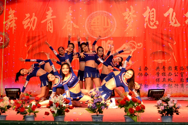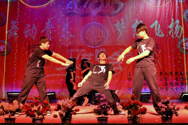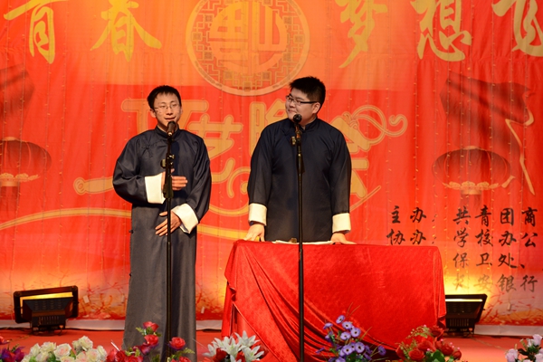 當晚的大學(xué)生活動中心張燈結(jié)彩,喜氣洋洋,洋溢著歡快的節(jié)日氣氛。晚會在《讓我們舞起來》歌伴舞的精彩表演中拉開序幕,歌舞、相聲、小品、魔術(shù)、朗誦等16個形式多樣、精彩紛呈的節(jié)目贏得了臺下觀眾們的陣陣喝彩。其中,由街舞學(xué)社選送的舞蹈《keep On Dancing》,用動感的舞步和滑稽的肢體語言顯示了同學(xué)們豐富多彩的校園生活和活潑陽光的青春風(fēng)采;漢服學(xué)社的同學(xué)們邁著輕快靈動、曼妙翩躚舞姿,用一支《重回漢唐》展示了漢代文化的博大精深;相聲《學(xué)富五車》語言詼諧幽默,表演者們精彩的表演贏得了全場熱烈的掌聲;被同學(xué)們冠以“樓姨”昵稱的宿舍管理員用一場《歡樂草原》的舞蹈將晚會氣氛的推向高潮。藝術(shù)學(xué)院的五位老師一首富有戲劇性的歌曲聯(lián)唱,展現(xiàn)了我校老師嚴肅又不失活潑的精神風(fēng)貌。