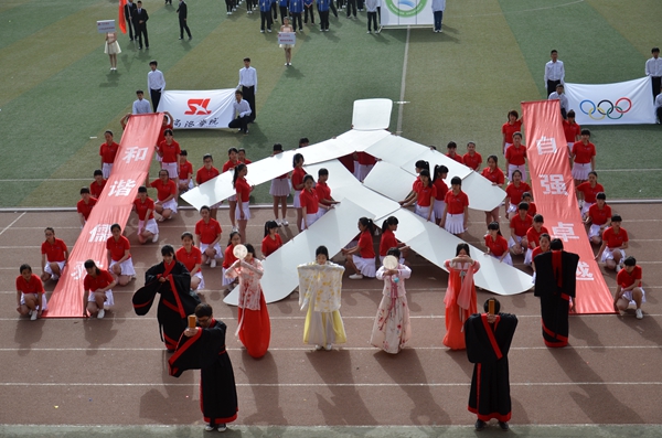 開幕式上,由西安理工大學(xué)、我校電子信息與電氣工程學(xué)院和城鄉(xiāng)規(guī)劃與建筑工程學(xué)院組成的航模隊(duì)以精彩的航模飛行表演拉開了本次大型文體表演的序幕,飛機(jī)模型帶著“預(yù)祝運(yùn)動(dòng)會(huì)圓滿成功”的祝福橫幅飛上藍(lán)天;生物醫(yī)藥與食品工程學(xué)院的團(tuán)體操《環(huán)舞青春,再創(chuàng)輝煌》激情四射,活力十足,擺出“2006”和“2015”的字樣,分別表示我校2006年專升本和2015年迎接教育部本科教學(xué)工作合格評(píng)估的兩個(gè)重要轉(zhuǎn)折點(diǎn);人文社會(huì)科學(xué)學(xué)院的太極拳表演《舞動(dòng)太極》剛?cè)嵯酀?jì),典雅大方,凝聚了傳統(tǒng)文化的精髓;電子信息與電氣工程學(xué)院的軍體拳表演《青春風(fēng)采》動(dòng)作整齊劃一,氣勢(shì)恢弘,40人擒拿氣勢(shì)威武,充滿陽剛之氣,雙截棍表演動(dòng)如雷霆,酷炫無敵,由320人擺出院徽“義”字,寓意他們?cè)趯W(xué)業(yè)上不斷向上,勇攀高峰,像海鷗般展翅飛翔,擁抱陽光,走向明天的輝煌;化學(xué)工程與現(xiàn)代材料學(xué)院的團(tuán)體表演《揚(yáng)帆起航》青春陽光,激情飛揚(yáng),用男子漢的力量和激情為整場表演畫上了圓滿的句號(hào)。