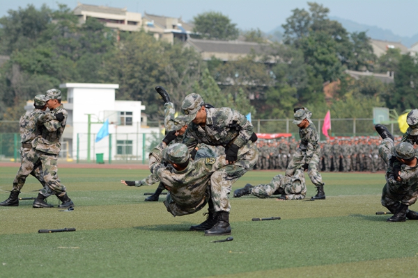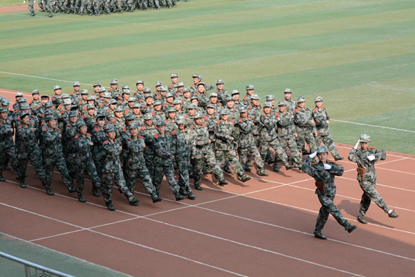 軍訓(xùn)團(tuán)各連組成持槍方陣、刺刀方陣、衛(wèi)生兵方陣等25個受閱方陣進(jìn)行了分列式表演。同學(xué)們口號嘹亮、動作整齊、步伐穩(wěn)健、英姿颯爽,以嚴(yán)整的軍容軍姿依次通過主席臺,充分展現(xiàn)了我校學(xué)生的精神風(fēng)貌。分列式結(jié)束后,我校學(xué)生進(jìn)行了刺殺操、花樣隊列和軍體拳匯報表演。男子刺殺操動作整齊利落、殺氣騰騰,展示了壓倒一切敵人的英雄氣概。伴隨著《強(qiáng)軍戰(zhàn)歌》的激揚(yáng)旋律,300名女兵進(jìn)行了花式隊列表演,她們排出了巨大的“70”“1945 2015”字樣,紀(jì)念抗日戰(zhàn)爭暨世界反法西斯戰(zhàn)爭勝利70周年,表達(dá)我校學(xué)生“銘記歷史、緬懷先烈、珍愛和平、開創(chuàng)未來”的堅定信念;在校歌《正道直行做棟梁》的旋律中,同學(xué)們又?jǐn)[出了我校?;盏牧Ⅲw造型,引來現(xiàn)場熱烈的掌聲。由720人表演的軍體拳動作精煉、節(jié)奏分明、套路連貫、氣勢磅礴、喊殺聲震天,贏得了現(xiàn)場陣陣熱烈的掌聲。軍訓(xùn)教官也進(jìn)行了捕俘拳表演,將現(xiàn)場氣氛推向了高潮。