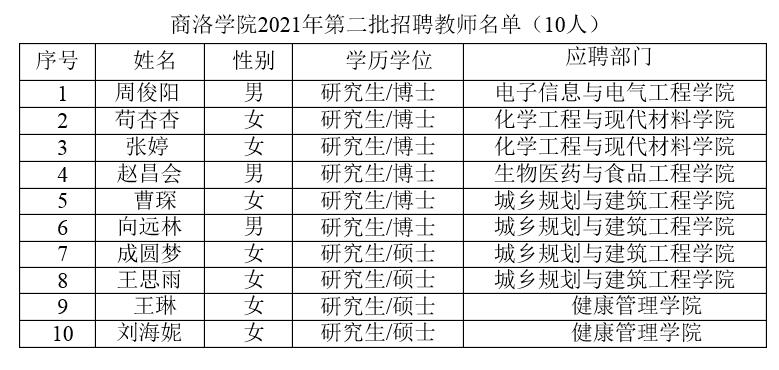 根據(jù)陜西省人事廳《關(guān)于陜西省事業(yè)單位公開招聘人員辦法》規(guī)定及《商洛學院2021年人才招聘公告》,經(jīng)過資格審查、試講、專家面試等環(huán)節(jié)考察,并經(jīng)院長辦公會2021年1月11日研究,同意招聘周俊陽等10位同志來我校工作,現(xiàn)予以公示。如有異議,請于2021年1月15日前紀委辦公室或人事處反映。