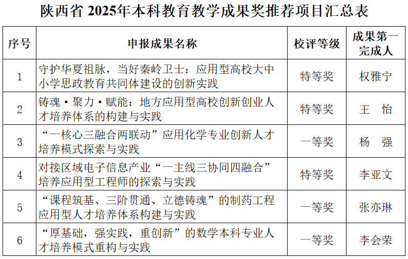 根據(jù)《關(guān)于開展2025年高等教育教學(xué)成果獎評審工作的通知》(陜教函〔2025〕688號)文件精神,我校認(rèn)真組織開展高等教育教學(xué)成果獎申報工作,經(jīng)各教學(xué)單位推薦,校內(nèi)外專家評審,學(xué)校教學(xué)工作委員會審定,擬推薦《聚守護華夏祖脈,當(dāng)好生態(tài)衛(wèi)士:秦嶺腹地大中小學(xué)思想政治教育一體化建設(shè)的創(chuàng)新實踐》等6個項目(見下表)申報2025年陜西省高等教育教學(xué)成果獎,現(xiàn)予以公示。