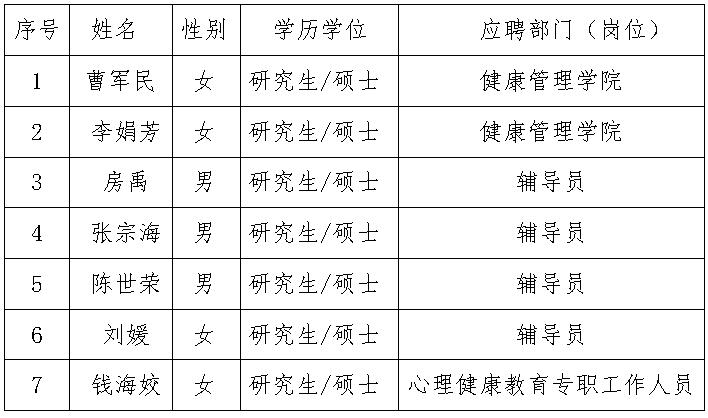 根據陜西省人社廳《關于陜西省事業(yè)單位公開招聘人員辦法》規(guī)定及《商洛學院2019年人才招聘計劃》,經過資格審查、試講(筆試)、專家面試等環(huán)節(jié)考察,并經院長辦公會2019年3月28日研究,同意招聘曹軍民等7位同志來我校工作,現予以公示。如有異議,請于2019年4月1日前向人事處或監(jiān)察室反映。