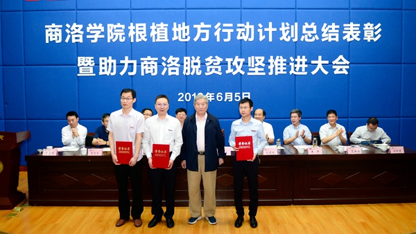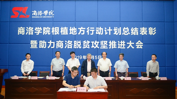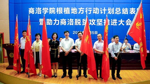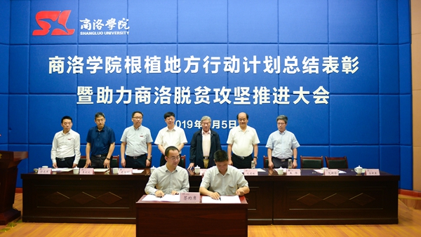 會議總結(jié)了我校根植地方行動計劃三年來取得的成效及經(jīng)驗,表彰了根植地方行動計劃先進集體及先進個人,頒發(fā)了2019年“趙鵬大院士獎教金”,為6個助力商洛脫貧攻堅人才服務(wù)團授旗。會上,我校與商洛高新區(qū)(商丹園區(qū))管委會簽訂了《合作共建商洛高新區(qū)創(chuàng)新創(chuàng)業(yè)示范園協(xié)議書》,與陜西森弗天然制品有限公司簽訂了《共建商洛學院-森弗健康學院協(xié)議》。