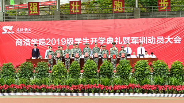 天朗氣清、秋風(fēng)送爽,巍巍學(xué)府、德渥群芳。9月5日上午,我校2019級(jí)學(xué)生開學(xué)典禮暨軍訓(xùn)動(dòng)員大會(huì)在學(xué)校體育場(chǎng)隆重舉行。黨委書記龍治剛、校長(zhǎng)范新會(huì)、紀(jì)委書記王思懷、黨委副書記彭虎軍,副校長(zhǎng)劉寶盈、劉勇,商州區(qū)人民武裝部部長(zhǎng)曹建明上校,武警商洛支隊(duì)副參謀長(zhǎng)、軍訓(xùn)團(tuán)團(tuán)長(zhǎng)呂喆中校,2015屆校友、第44屆世界技能大賽銅獎(jiǎng)獲得者、中航工業(yè)陜西飛機(jī)制造公司職工高雨楠出席大會(huì)。各二級(jí)學(xué)院(部)黨政主要負(fù)責(zé)人、有關(guān)職能部門負(fù)責(zé)人,2019級(jí)全體新生及家長(zhǎng)代表參加大會(huì)。大會(huì)由彭虎軍主持。