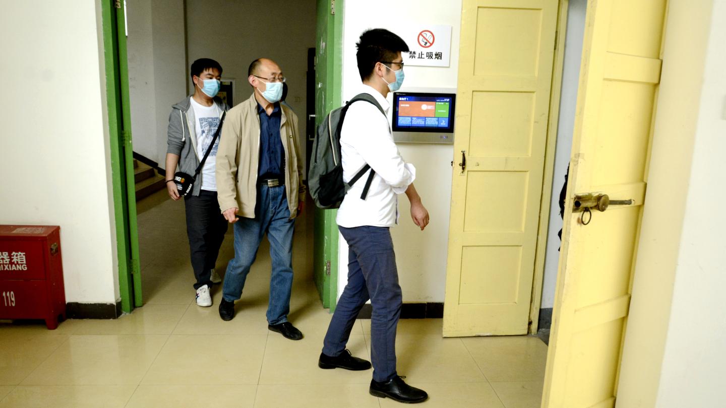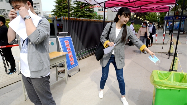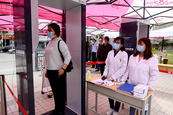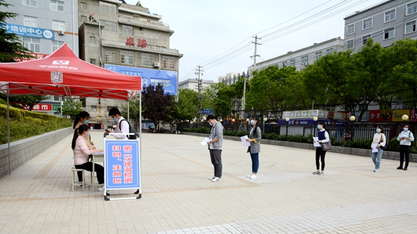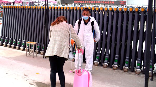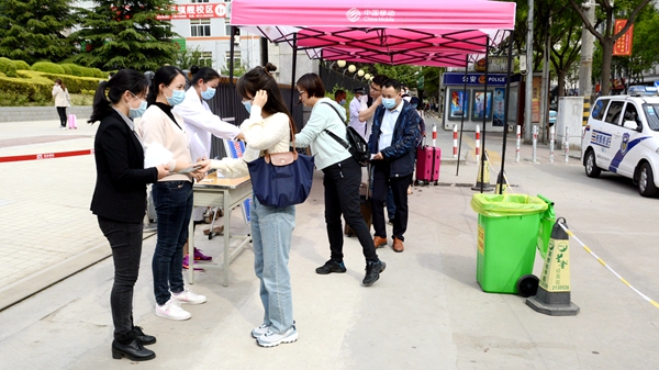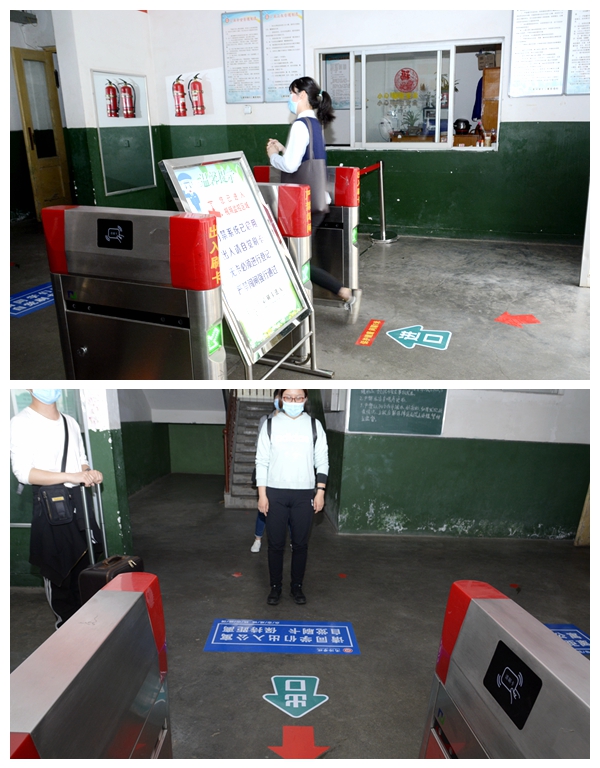 隨著龍治剛“演練開始”一聲令下,緊張有序的演練正式拉開帷幕,幾十余名“學(xué)生”在學(xué)校大門口外保持1.5米間隔依次進(jìn)入消毒通道,卸下舊口罩投棄到專用垃圾箱后佩戴工作人員配發(fā)的一次性醫(yī)用口罩,經(jīng)工作人員查驗(yàn)有效證件后進(jìn)入校門口自動(dòng)測(cè)溫門,進(jìn)行第一次體溫檢測(cè)。體溫檢測(cè)正常的學(xué)生按照指示線到一號(hào)教學(xué)樓前的各學(xué)院接待點(diǎn)接受二次體溫檢測(cè)、掃描驗(yàn)證健康二維碼、填寫健康承諾書。