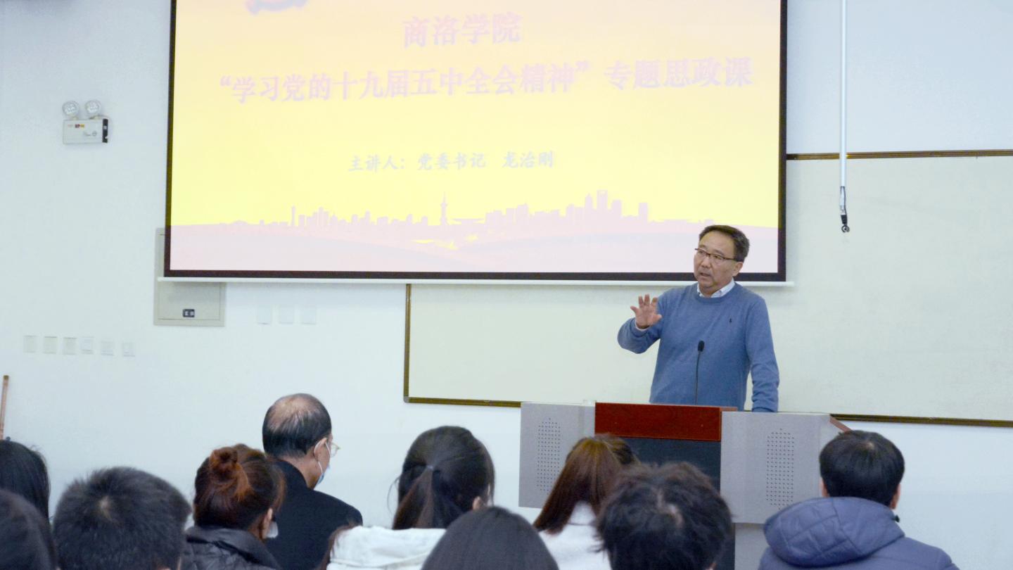 校黨委書記龍治剛在思政課上圍繞黨的十九屆五中全會的意義、主要內容和重大部署等方面,結合高等教育實際,對全會精神進行了全面宣講和深入闡釋。他用一個新奮斗目標、兩個統(tǒng)籌計劃、三個"新"、四個全面新布局、五大發(fā)展理念、六個發(fā)展目標解讀了規(guī)劃《建議》,引導青年大學生切實把思想和行動統(tǒng)一到全會精神上來,把青年人的智慧和力量匯聚到實現(xiàn)全會確定的各項目標任務上來,將個人理想與國家理想相融合,立志為這個偉大的新時代“立德、立功、立言”。他談到,“青春是用來奮斗的”,新時代大學生應珍惜歷史機遇,胸懷實現(xiàn)中華民族偉大復興的中國夢,立志為國奉獻、為民服務,成為中國特色社會主義事業(yè)的接班人,做有理想有擔當?shù)臅r代新人。