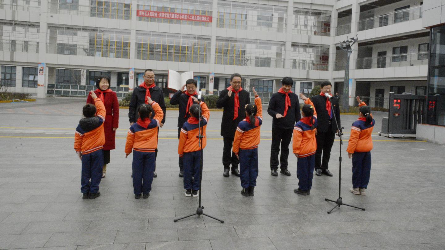 儀式伊始,小學(xué)生代表為與會領(lǐng)導(dǎo)嘉賓佩戴紅領(lǐng)巾。