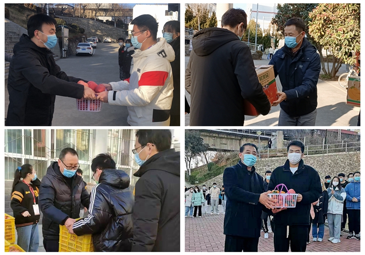 今年,受新冠疫情影響,全體學(xué)生在學(xué)校度過元旦佳節(jié),為使同學(xué)們度過一個(gè)溫馨、和諧、快樂的元旦,學(xué)校為全體學(xué)生精心準(zhǔn)備了新年禮物。1月1日,校領(lǐng)導(dǎo)張志昌、范新會(huì)、彭虎軍、劉勇、劉寶盈、王新軍分別深入北新街校區(qū)和丹江校區(qū),為全體學(xué)生送去蘋果、橘子等新年禮物,祝福同學(xué)們?cè)谛碌囊荒昶桨布?、學(xué)業(yè)有成,取得更大成績。