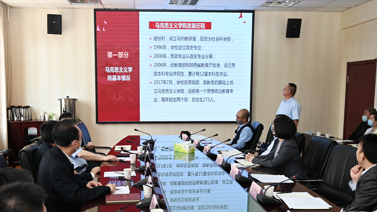 根據(jù)陜西省委宣傳部、省委教育工委相關(guān)要求,我校積極申報(bào)建設(shè)陜西省第二批重點(diǎn)馬克思主義學(xué)院培育單位。5月19日上午,在省委宣傳部二級(jí)巡視員可小鬧的帶領(lǐng)下,由西安交通大學(xué)馬克思主義學(xué)院院長(zhǎng)燕連福任組長(zhǎng),長(zhǎng)安大學(xué)馬克思主義學(xué)院院長(zhǎng)陳懷平、西安理工大學(xué)馬克思主義學(xué)院院長(zhǎng)梁嚴(yán)冰為成員的專家組來(lái)到我校,實(shí)地檢查評(píng)估重點(diǎn)馬克思主義學(xué)院培育單位建設(shè)情況。校黨委書記張志昌出席評(píng)審匯報(bào)會(huì)并致辭。黨委副書記彭虎軍主持匯報(bào)會(huì)。