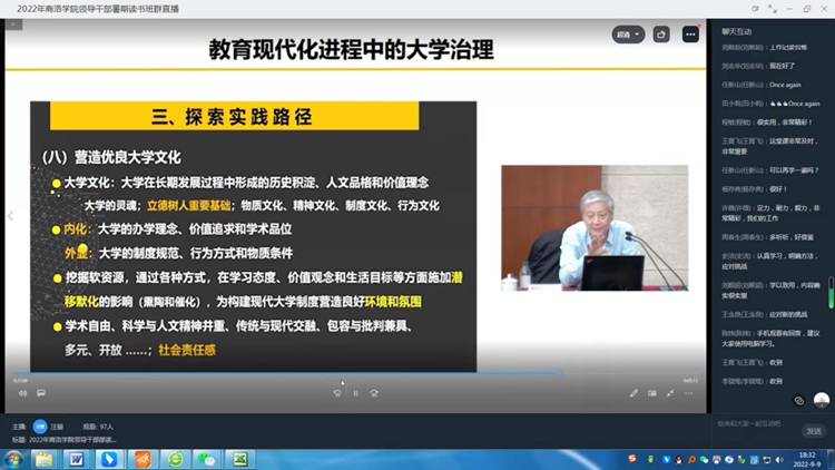 按照省委教育工委、省教育廳統(tǒng)一安排,9月8日至9日,我校105名處級(jí)以上領(lǐng)導(dǎo)干部參加了由省委教育工委主辦的2022年全省高校領(lǐng)導(dǎo)干部暑期讀書班。結(jié)合當(dāng)前疫情防控形勢,本次讀書班采用線上視頻會(huì)議形式舉行。