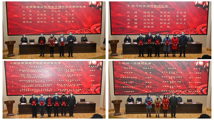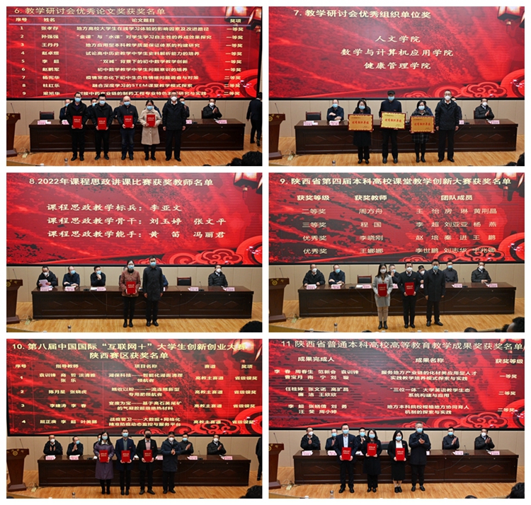 大會(huì)對(duì)我校2022年度優(yōu)秀教案、優(yōu)秀電子課件獲獎(jiǎng)教師,優(yōu)秀實(shí)習(xí)指導(dǎo)教師、優(yōu)秀畢業(yè)論文指導(dǎo)教師,校級(jí)教育教學(xué)成果獎(jiǎng)、校級(jí)一流課程、教育教學(xué)研討會(huì)優(yōu)秀論文、優(yōu)秀組織單位、校級(jí)課程思政講課比賽獲獎(jiǎng)教師、陜西省第四屆本科高校課堂教學(xué)創(chuàng)新大賽獲獎(jiǎng)教師、第八屆中國(guó)國(guó)際“互聯(lián)網(wǎng)+”大學(xué)生創(chuàng)新創(chuàng)業(yè)大賽指導(dǎo)教師、陜西省普通本科高校高等教育教學(xué)成果獎(jiǎng)獲獎(jiǎng)教師進(jìn)行了表彰。出席大會(huì)的校領(lǐng)導(dǎo)為受表彰的集體和個(gè)人頒發(fā)了證書。