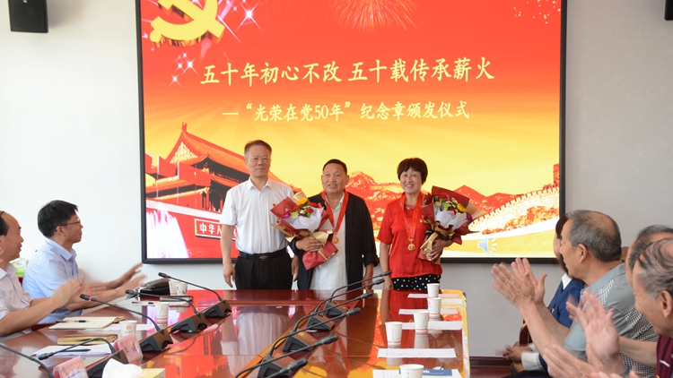 為進一步增強老黨員的榮譽感、歸屬感,張志昌代表學校黨委向黨齡50周年的老黨員代表陳淑芳、陳守榮頒發(fā)“光榮在黨50年”紀念章,并送上鮮花和祝福,充分肯定和感謝老黨員為學校發(fā)展作出的突出貢獻。