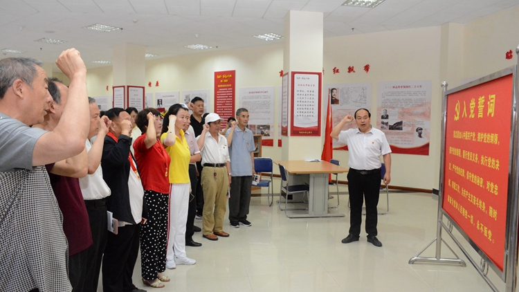活動中,離退休老黨員還參觀了學校紅色文化資料館,在紅色文化浸潤下集體重溫入黨誓詞。陳淑芳、王天時兩位老黨員代表分享了多年在黨、愛黨的心得體會。