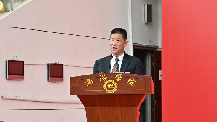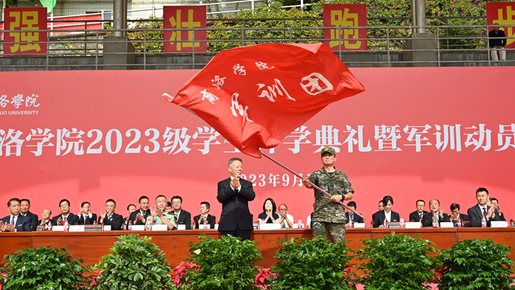 伴隨著五星紅旗冉冉升起,開(kāi)學(xué)典禮在雄壯的國(guó)歌聲中拉開(kāi)帷幕。校黨委書(shū)記張志昌為承訓(xùn)教官授予2023級(jí)學(xué)生軍訓(xùn)團(tuán)團(tuán)旗。校長(zhǎng)范新會(huì)以“保持奮斗本色,踔厲奮發(fā),勇毅前行”為題,為全體新生講授“開(kāi)學(xué)第一課”。朱鵬波為全體承訓(xùn)教官和新生作軍訓(xùn)動(dòng)員講話。