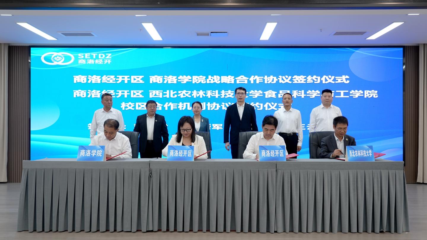 為推動(dòng)校區(qū)合作和產(chǎn)學(xué)研深度融合,提升商洛經(jīng)濟(jì)技術(shù)開(kāi)發(fā)區(qū)科技創(chuàng)新與經(jīng)濟(jì)發(fā)展效能,9月29日,商洛經(jīng)開(kāi)區(qū)校區(qū)合作共建食品產(chǎn)業(yè)園簽字儀式在商洛市舉行。商洛市委副書(shū)記、商洛經(jīng)開(kāi)區(qū)黨工委書(shū)記趙孝,洛南縣委書(shū)記楊長(zhǎng)江,校長(zhǎng)權(quán)雅寧、副校長(zhǎng)王新軍出席簽約儀式。趙孝、權(quán)雅寧共同為“商洛學(xué)院陜西省大學(xué)科技園綠色食品產(chǎn)學(xué)研示范基地”和“商洛學(xué)院電商直播實(shí)踐教學(xué)基地”揭牌。王新軍代表學(xué)校和商洛經(jīng)開(kāi)區(qū)黨工委副書(shū)記蔣金君簽署戰(zhàn)略合作協(xié)議。簽約儀式由商洛經(jīng)開(kāi)區(qū)管委會(huì)主任彭書(shū)旺主持。