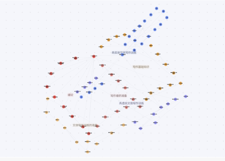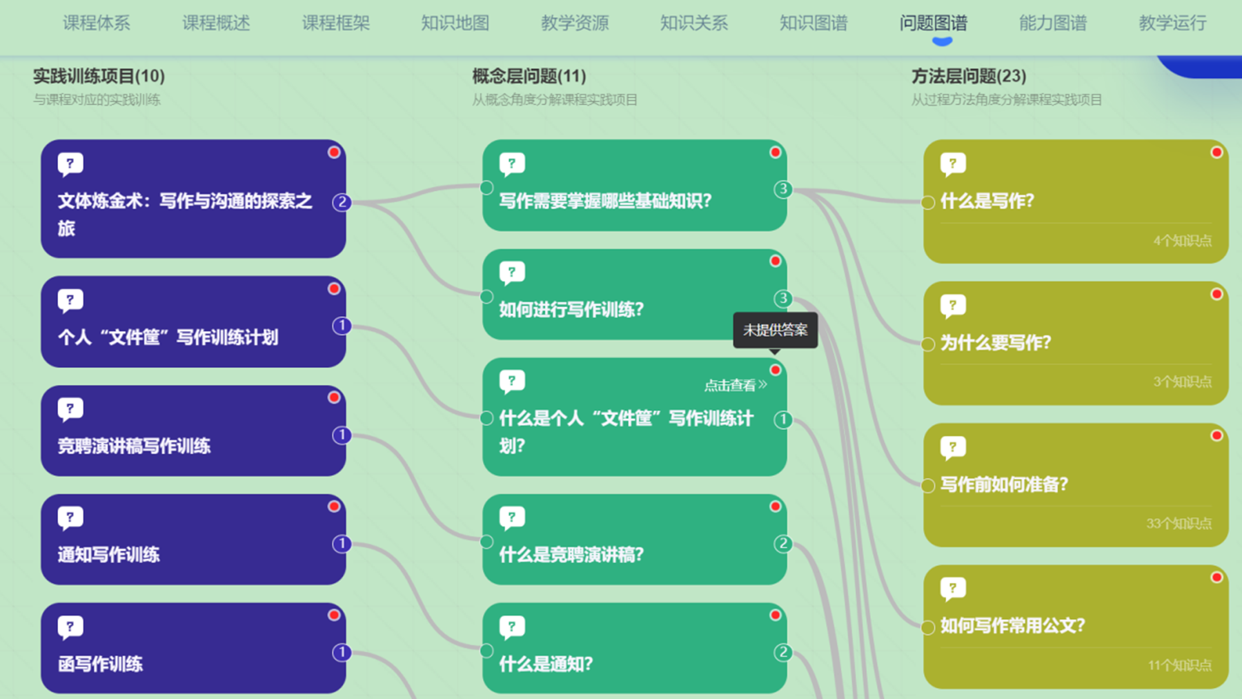 與傳統(tǒng)的視頻課程資源建設(shè)相比,知識圖譜課程更加智慧化、數(shù)智化,將可視化的課程體系呈現(xiàn)給師生,幫助教師在教學(xué)中更好地服務(wù)學(xué)生。課程采用工作情景模擬和角色意識提升的方法,將寫作理論置于實際情境中,以溝通為寫作核心,設(shè)計具有挑戰(zhàn)性的任務(wù)和項目,凸顯課程兩大特點:學(xué)法創(chuàng)新——寫作“文件筐”訓(xùn)練法強化學(xué)生自我管理;成果導(dǎo)向——加深學(xué)生學(xué)習(xí)過程體驗,提升其寫作能力與溝通能力。同時,引入教育教學(xué)AI,將現(xiàn)有的課程資源進行碎片化再利用,給學(xué)生更多的學(xué)習(xí)資源選擇和路徑選擇。學(xué)生可基于知識點及關(guān)鍵詞,使用AI檢索教學(xué)資源;教師可利用AI技術(shù),分析學(xué)生的學(xué)習(xí)行為和學(xué)習(xí)結(jié)果,綜合判斷學(xué)生對知識點的掌握度,更加精準(zhǔn)地掌握學(xué)情,實現(xiàn)更好地“備學(xué)生”。