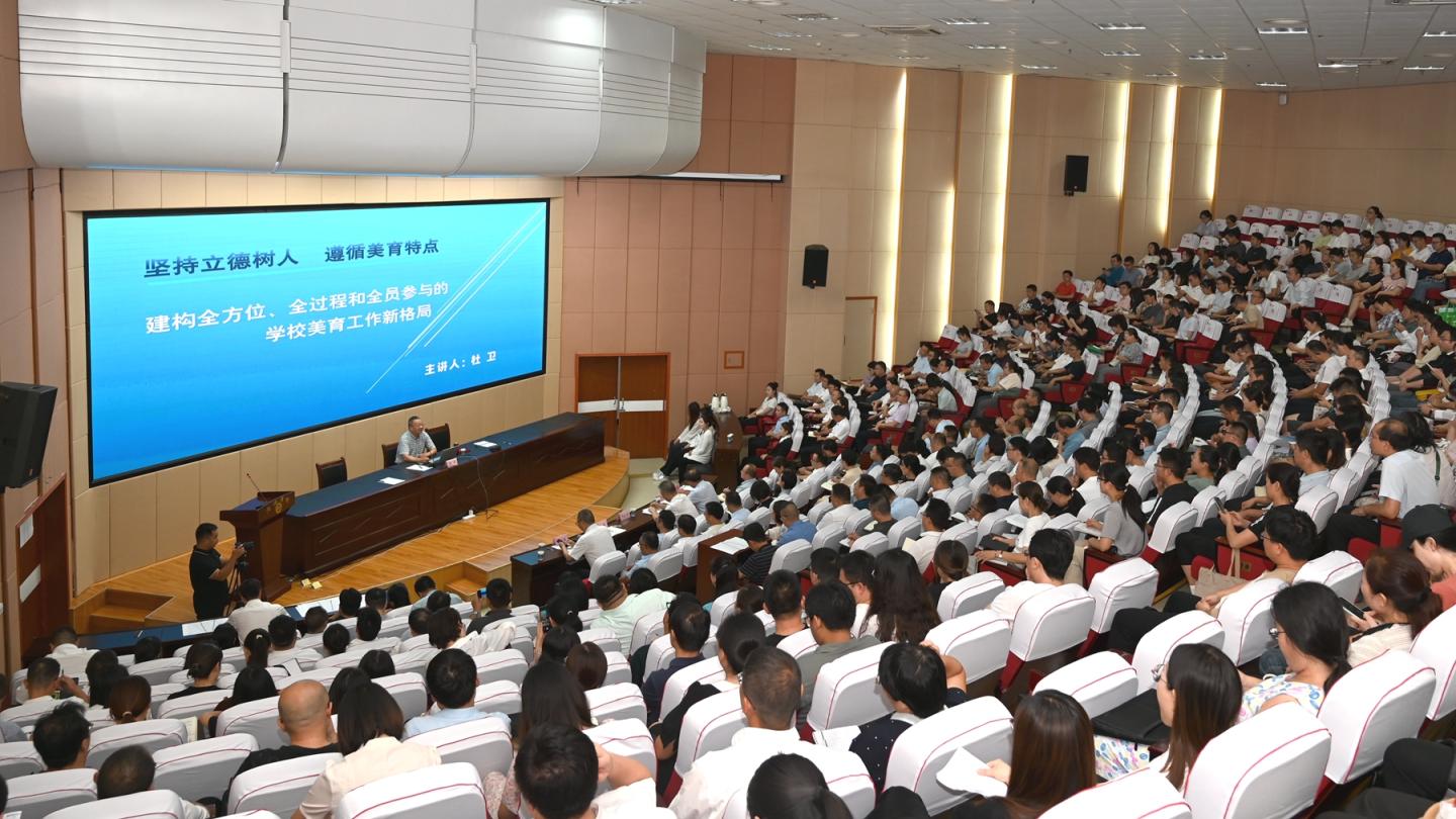 杜衛(wèi)教授以《堅持立德樹人,遵循美育特點,建構(gòu)全方位、全過程和全員參與的學校美育工作新格局》為主題,結(jié)合審美經(jīng)驗特點、人文教育的定義、基于審美經(jīng)驗的人文教育特點以及中國傳統(tǒng)美育方法論等理論知識,圍繞美育浸潤學生、教師和校園的具體目標以及八項浸潤行動,對《教育部關于全面實施學校美育浸潤行動的通知》(以下簡稱《通知》)的精神內(nèi)涵進行了詳細的闡釋。杜衛(wèi)指出,《通知》是貫徹落實習近平總書記關于做好美育工作重要指示精神的一項重大舉措,是全面貫徹黨的教育方針、落實立德樹人根本任務、大力發(fā)展素質(zhì)教育,進一步加強和改進學校美育工作的一次全面具體部署。杜衛(wèi)強調(diào),要不斷強化各學科教師的美育意識和美育素養(yǎng),注重美育的多樣化和個性化,在充滿情趣和活力的美育教學過程中激發(fā)學生的積極性、提高學生的參與度,展現(xiàn)青年學生的自信和風采,讓美育真正成為發(fā)展學生創(chuàng)造力的重要途徑。