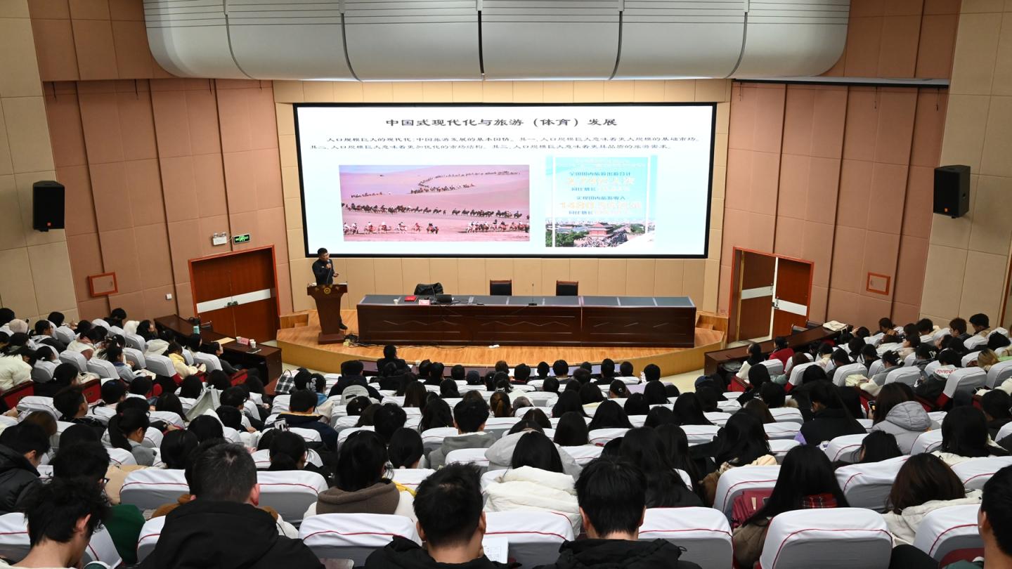 聘任儀式結束后,張婧教授作了題為《如何做好自己健康的第一責任人》的報告。她從影響健康的因素出發(fā),提出“運動零食計劃”的新理念,對部分體育鍛煉案例進行分析,最終以研究成果反哺實踐應用。楊濤教授以《中國式現代化與體育旅游業(yè)高質量發(fā)展》為題,從中國式現代化與體育旅游發(fā)展、綠色發(fā)展理念的內涵與價值、體育旅游產業(yè)的高質量發(fā)展、綠色發(fā)展理念與高質量發(fā)展的邏輯關系、體育產業(yè)與健康養(yǎng)老、文化旅游融合發(fā)展五個方面展開詳細闡述,結合商洛實際情況提出了“體育+旅游+康養(yǎng)”的融合發(fā)展新模式。