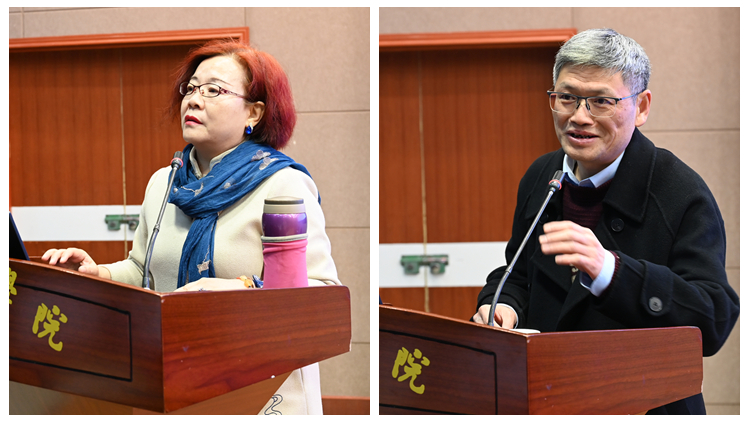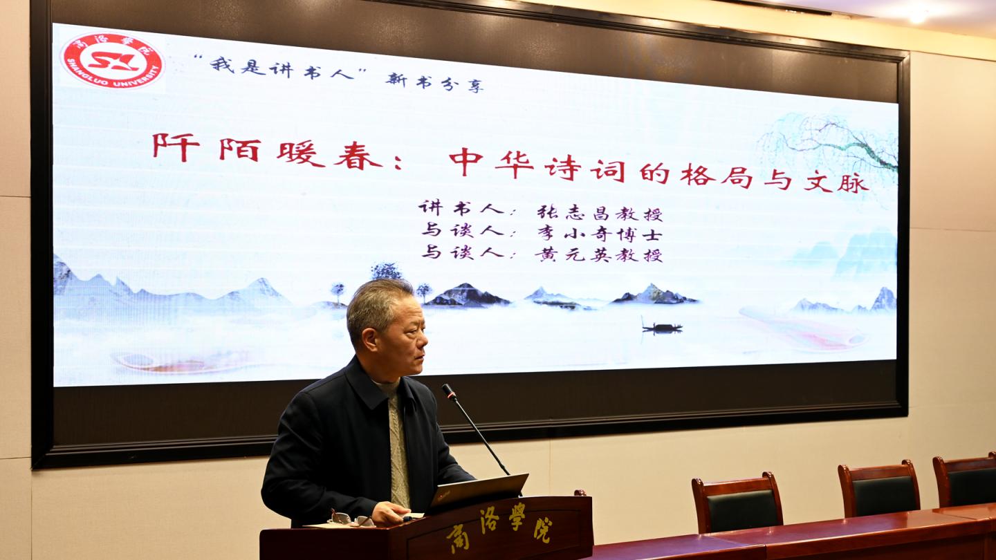 在新書分享環(huán)節(jié),張志昌教授和黃元英教授分別分享了《阡陌暖春:中華詩詞的格局與文脈》和《商州記憶》兩部新著?!囤淠芭海褐腥A詩詞的格局與文脈》通過帶領(lǐng)讀者游覽中國詩詞的長河,幫助讀者用心體悟中國詩詞的藝術(shù)之美、精神之美、境界之美,幫助讀者切實(shí)感受到歷代詩人的家國情懷與人文關(guān)懷,讓讀者捧卷徜徉于美輪美奐的詩詞叢林之時,享受到詩意地棲居于華夏暖春的幸福?!渡讨萦洃洝吠ㄟ^跨越歷史時空的心靈對話,抒發(fā)了秦嶺人對秦嶺魂?duì)繅艨M的鄉(xiāng)愁。張文諾教授、薛璞喆博士分別從著作的文學(xué)魅力、文化意義以及歷史美學(xué)視角對《商州記憶》進(jìn)行了精彩深刻的評述。李小奇博士和黃元英教授立足個人視角分別從引發(fā)讀者共情的章節(jié)及觀點(diǎn)、學(xué)術(shù)價(jià)值思考等方面對《阡陌暖春:中華詩詞的格局與文脈》展開了賞析。