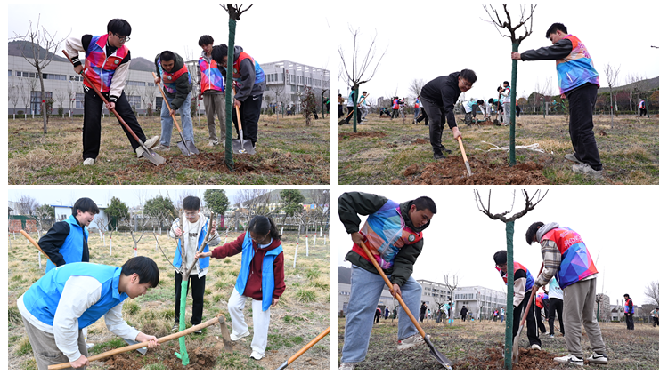 植樹(shù)現(xiàn)場(chǎng)熱火朝天,師生們相互配合、分工協(xié)作,鏟土圍堰、扶苗填坑、培土壓實(shí)、提水澆灌,栽種50株櫻花、50株碧桃,為把校園建設(shè)為“推窗見(jiàn)綠、起步聞香”的育人沃土增添了新的生機(jī)。