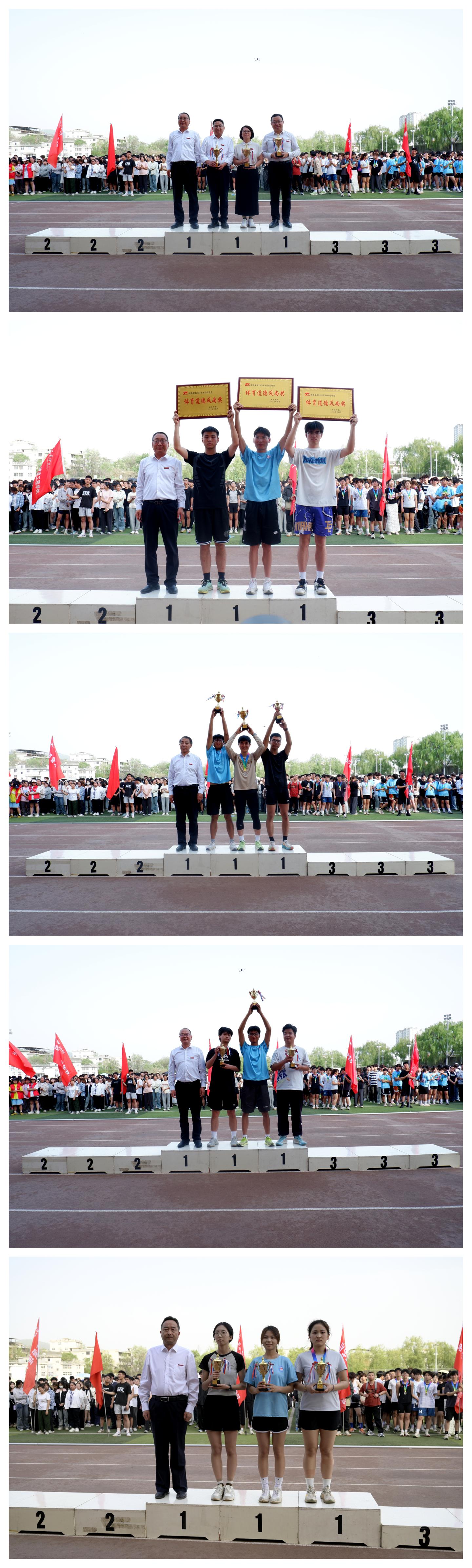 在熱烈的掌聲中,劉寶盈分別為獲得教工組團(tuán)體總分前三名和體育道德風(fēng)尚獎的學(xué)院頒獎,王新軍為團(tuán)體總分前三名頒獎,郭瑾為男子團(tuán)體總分前三名頒獎,張向東為女子團(tuán)體總分前三名頒獎。