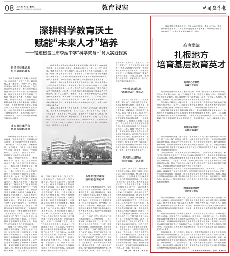 6月3日,《中國教育報》“教育視窗”欄目刊發(fā)了校長權(quán)雅寧署名文章《商洛學(xué)院扎根地方培育基層教育英才》,對我校扎根秦嶺培育教育人才的經(jīng)驗成果進(jìn)行了專題報道。