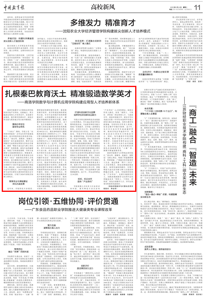 6月24日,《中國教育報(bào)》“高校新風(fēng)”版面以《扎根秦巴教育沃土精準(zhǔn)鍛造數(shù)學(xué)英才——商洛學(xué)院數(shù)學(xué)與計(jì)算機(jī)應(yīng)用學(xué)院構(gòu)建應(yīng)用型人才培養(yǎng)新體系》為題刊發(fā)專題報(bào)道。文章從“圍繞辦學(xué)定位凝練專業(yè)特色”“聚焦專業(yè)與課程建設(shè)深化內(nèi)涵發(fā)展”“打造科技創(chuàng)新文化品牌培養(yǎng)學(xué)生的創(chuàng)新創(chuàng)業(yè)能力”“校校、校企合作堅(jiān)持‘產(chǎn)出導(dǎo)向’”四個(gè)方面全面介紹了我校數(shù)計(jì)學(xué)院扎根地方構(gòu)建應(yīng)用型數(shù)學(xué)人才培養(yǎng)新體系的實(shí)踐探索和成果經(jīng)驗(yàn)。