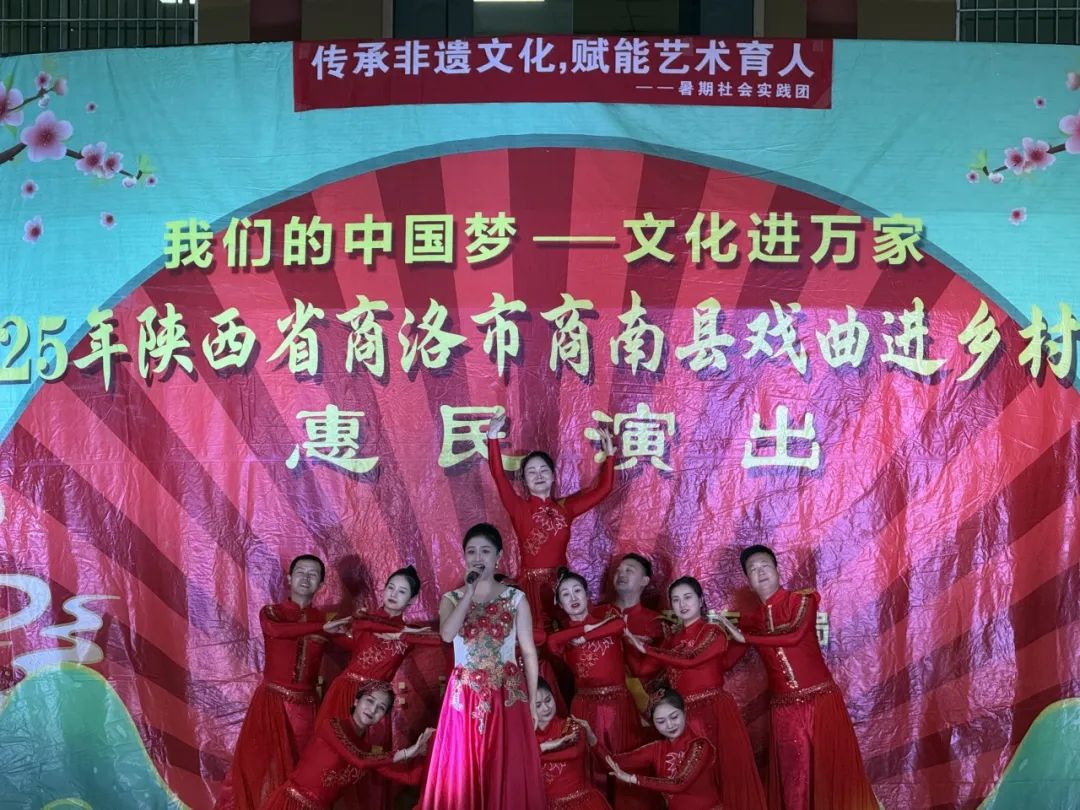 ——文化展演“惠民生”。藝術學院“傳承非遺文化,賦能藝術育人”暑期社會實踐團赴商南縣富水鎮(zhèn)桑樹村等地,與縣劇團專業(yè)演員聯(lián)袂登臺,為當?shù)卮迕瘾I上“戲曲進鄉(xiāng)村”文化惠民演出,為鄉(xiāng)村文化振興注入青春動能。