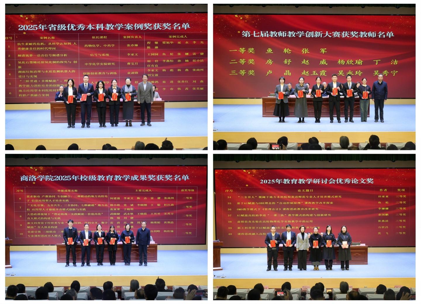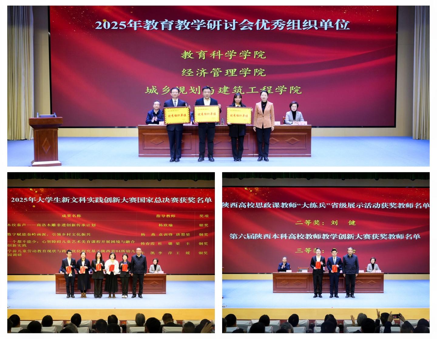 大會表彰了2025年教育教學研討會優(yōu)秀論文獎獲獎教師、第七屆教師教學創(chuàng)新大賽獲獎教師、2025年校級教育教學成果獎獲獎教師、2025年省級優(yōu)秀本科教學案例獎獲獎教師、陜西高校思政課教師“大練兵”省級展示活動獲獎教師、第六屆陜西本科高校教師教學創(chuàng)新大賽獲獎教師、2025年大學生新文科實踐創(chuàng)新大賽國家總決賽獲獎項目指導教師及教學研討會優(yōu)秀組織單位。