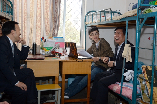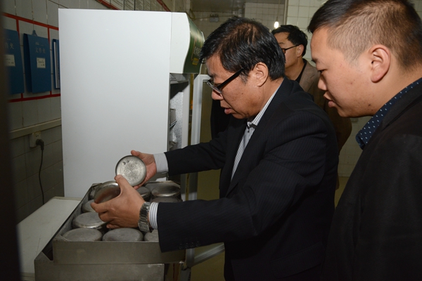 在彭虎軍和學(xué)校辦公室、保衛(wèi)處、后勤保障處相關(guān)負責(zé)人的陪同下,張玉明深入我校食堂、公寓和監(jiān)控中心視察。每到一處,張玉明都詳細了解相關(guān)安全制度及落實情況,仔細檢查安全設(shè)施的維護保養(yǎng)狀況,并和學(xué)生進行了現(xiàn)場交流,傾聽他們的意見和建議。在學(xué)生食堂,張玉明仔細檢查了操作間的衛(wèi)生條件、飯菜樣本,詢問了解飯菜品種、價格情況,嚴格要求食堂工作人員把好食品安全關(guān)。在學(xué)生公寓,張玉明認真檢查了公寓管理日志,詳細了解公寓安全管理各項制度的執(zhí)行落實情況,并在宿舍里向?qū)W生詢問了對學(xué)校各項工作的意見。