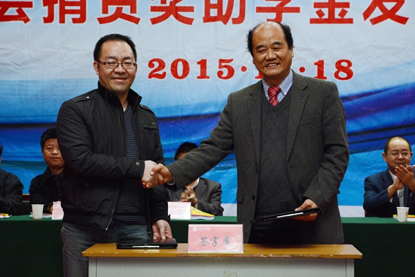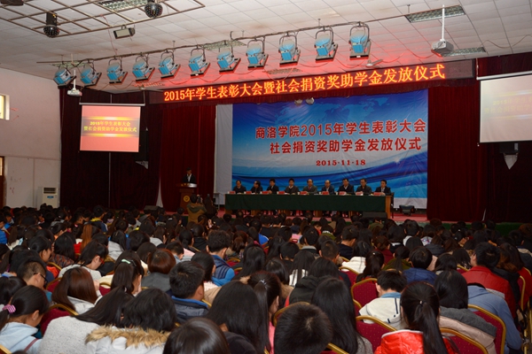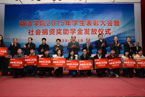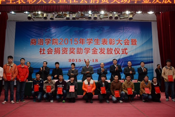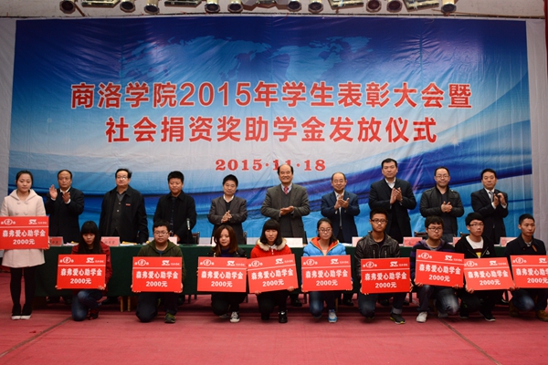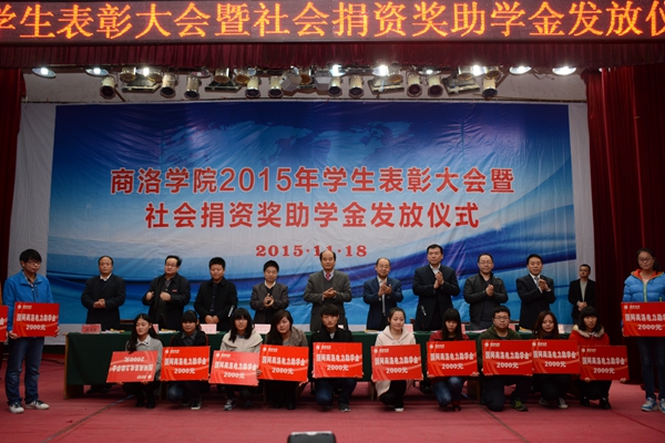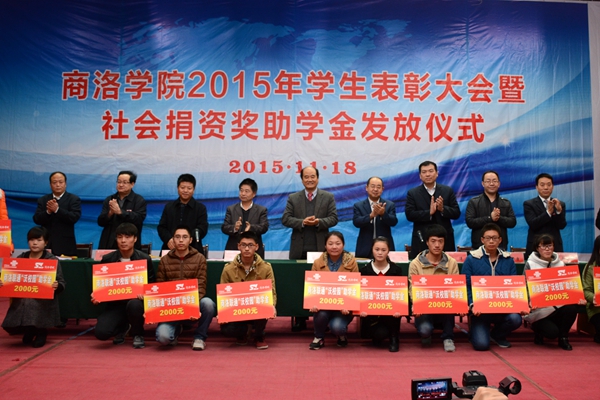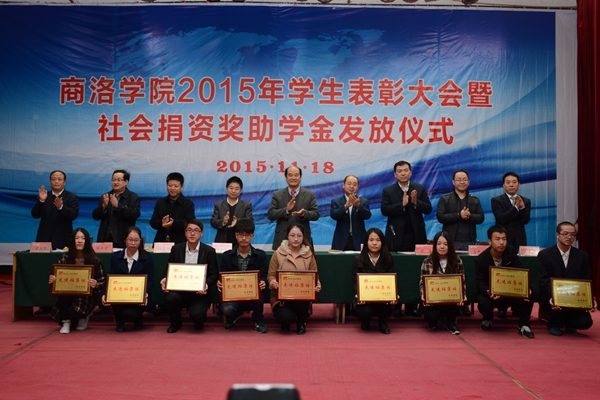 11月18日,我校舉辦2015年學(xué)生表彰大會暨社會捐資獎助學(xué)金發(fā)放儀式, 表彰2014-2015學(xué)年先進班集體、三好學(xué)生和優(yōu)秀學(xué)生干部,舉行商洛學(xué)院與陜西森弗天然制品有限公司校企合作簽字儀式,發(fā)放“國網(wǎng)商洛電力”助學(xué)金、商洛聯(lián)通“沃校園”助學(xué)金、商洛郵政“鴻雁愛心”助學(xué)金、商洛電信“天翼”助學(xué)金、“森弗愛心”獎學(xué)金和“森弗愛心”助學(xué)金。校領(lǐng)導(dǎo)劉建林、魏書堂、彭虎軍,商洛供電局黨委書記陳飛,中國聯(lián)通商洛分公司總經(jīng)理古濤,商洛市郵政分公司副總經(jīng)理周永春,中國電信商洛分公司副總經(jīng)理江長路、陜西森弗天然制品有限公司董事長、總經(jīng)理金新康出席了大會。大會由學(xué)生處處長石啟英主持。
