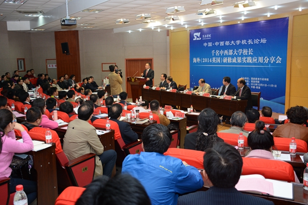 10月31-11月1日,“中國?中西部大學校長論壇——千名中西部大學校長海外(2014英國)研修成果實踐應用分享會”在我校隆重召開。來自全國17個省市22所中西部大學的40余位書記、校長、專家齊聚我校,共同探討交流應用型本科院校建設等有關問題。教育部港澳臺辦常務副主任趙靈山、國家教育行政學院涉外培訓部主任樊平軍、陜西省委高教工委常務副書記董小龍,商洛市委常委、副市長武文罡出席會議。
