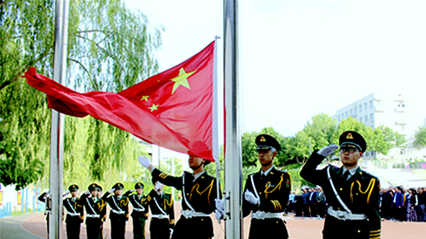 7點(diǎn)20分,在全體師生的注目下,國(guó)旗護(hù)衛(wèi)隊(duì)護(hù)送鮮艷的五星紅旗進(jìn)場(chǎng),伴隨著雄壯的國(guó)歌,五星紅旗冉冉升起,全體師生神情肅穆,向莊嚴(yán)的國(guó)旗表達(dá)著最崇高的敬意。